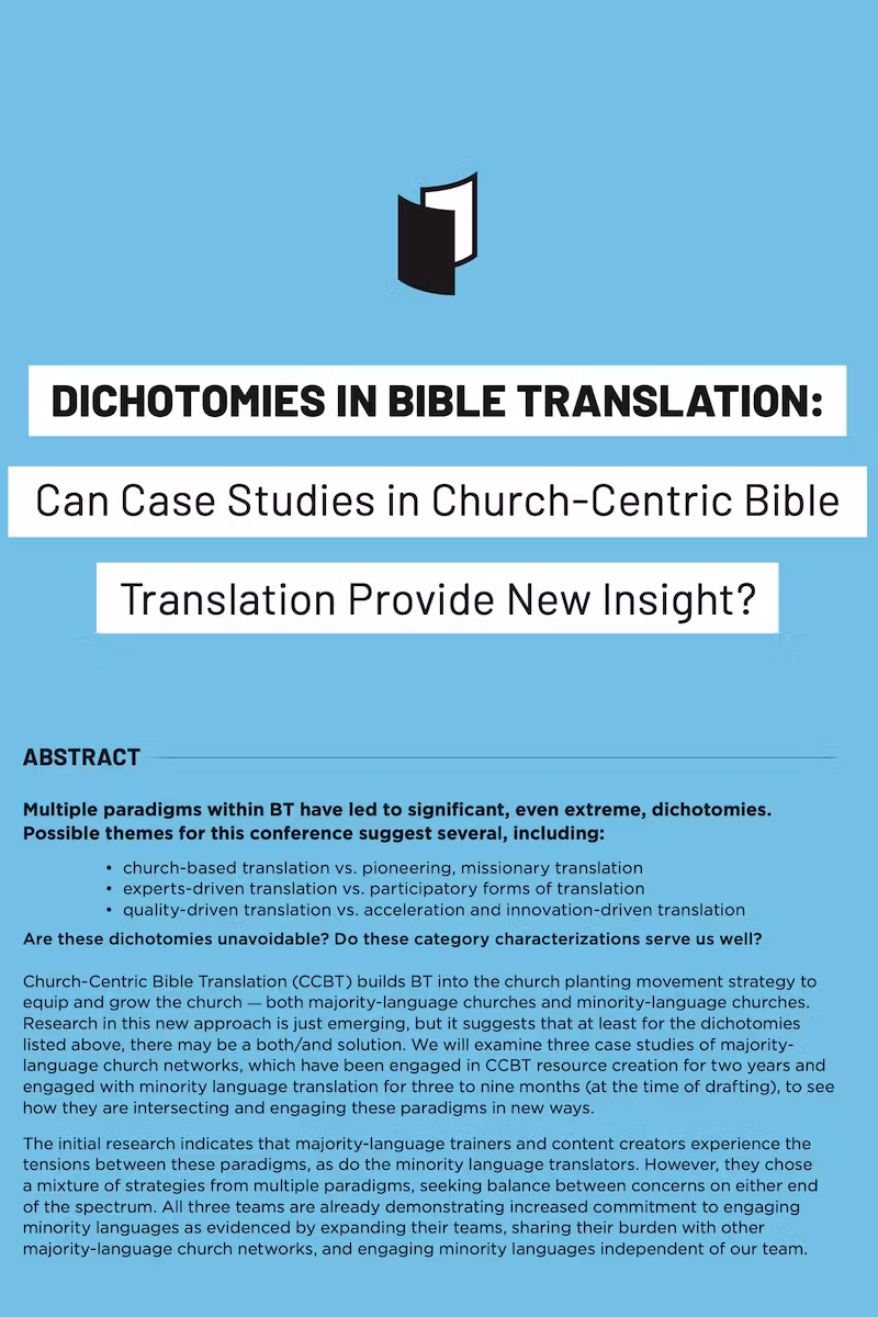 Church-Centric Bible Translation (CCBT) builds BT into the church planting movement strategy to equip and grow the church — both majority-language churches and minority-language churches. We will examine three case studies of majority- language church networks, which have been engaged in CCBT resource creation for two years and engaged with minority language translation for three to nine months (at the time of drafting), to see how they are intersecting and engaging these paradigms in new ways.
