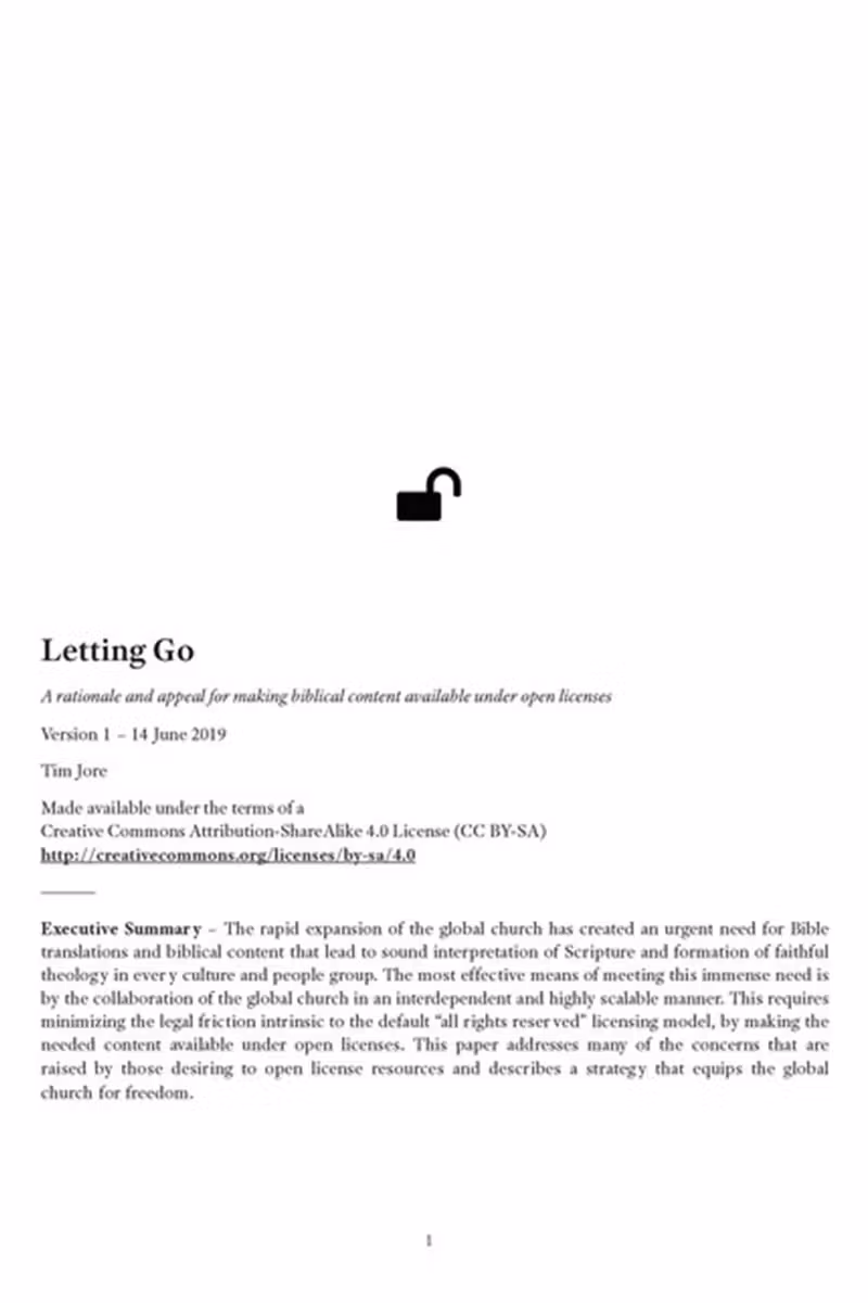 Letting Go describes how the rapid expansion of the global church has created an urgent need for Bible translations and biblical content that lead to sound interpretation of Scripture and formation of faithful theology in every culture and people group. The most effective means of meeting this immense need is by the collaboration of the global church in an interdependent and highly scalable manner. This requires minimizing the legal friction intrinsic to the default “all rights reserved” licensing model, by making the needed content available under open licenses. This paper addresses many of the concerns that are raised by those desiring to open license resources and describes a strategy that equips the global church for freedom.