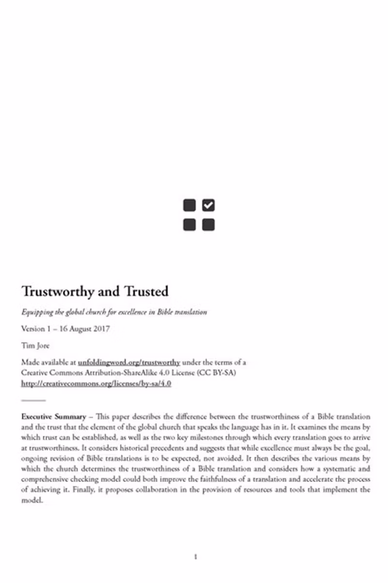Trustworthy and Trusted describes the difference between the trustworthiness of a Bible translation and the trust that the element of the global church that speaks the language has in it. It examines the means by which trust can be established, as well as the two key milestones through which every translation goes to arrive at trustworthiness. It considers historical precedents and suggests that while excellence must always be the goal, ongoing revision of Bible translations is to be expected, not avoided. It then describes the various means by which the church determines the trustworthiness of a Bible translation and considers how a systematic and comprehensive checking model could both improve the faithfulness of a translation and accelerate the process of achieving it. Finally, it proposes collaboration in the provision of resources and tools that implement the model.